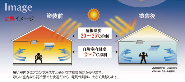 遮熱性能:太陽光を効率よく反射+熱放射で、建物内部の温度上昇を抑制